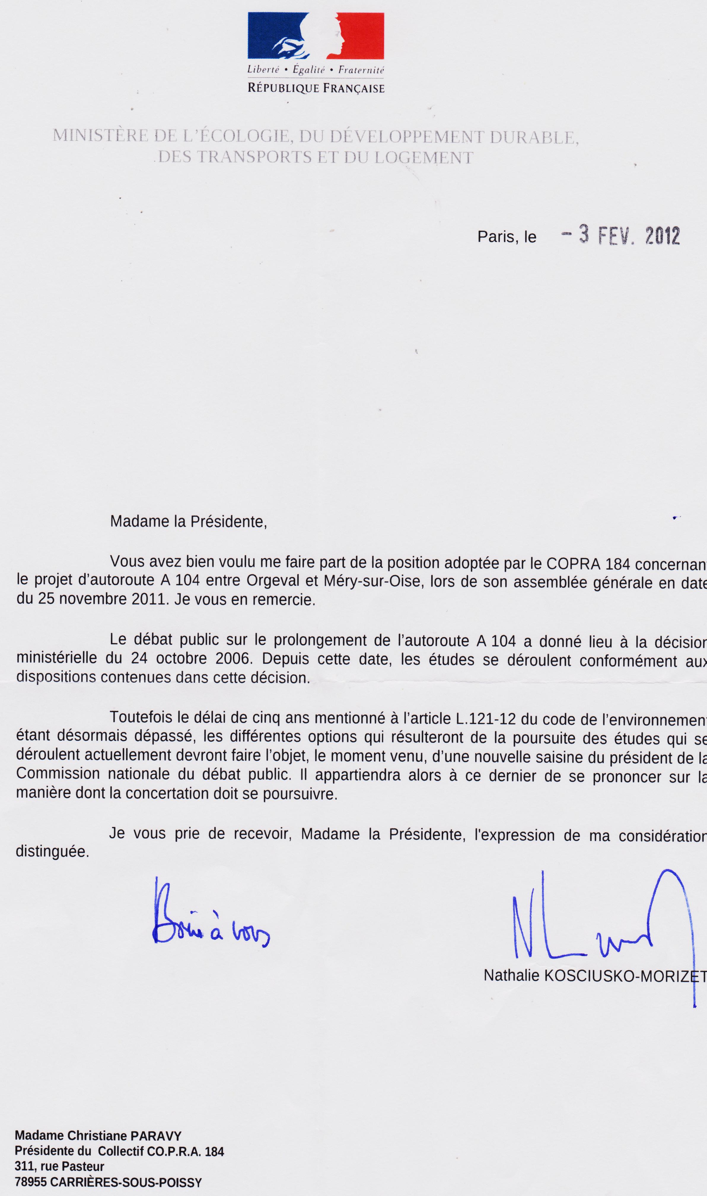 17 février 2012 : le CO.P.R.A. 184 écrit à Madame la Ministre Nathalie KOSCIUSKO-MORIZET pour lui faire part de notre étonnement d'avoir découvert l'appel d'offres lancé par l'Etat pour la réalisation des études de prolongement de la Francilienne A 104 de Méry-sur-Oise à Achères. Etudes, en vue de l'enquête publique préalable à la D.U.P. La réponse reçue de la Ministre le 03 février 2012 ne faisait aucune allusion à cette décision de vouloir faire des études sur un tronçon Nord limité à Achères.( Ce courrier est mis en fichier attaché en fin d'article)