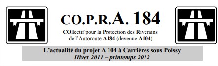 • Questionnement de la Ministre NKM après avoir découvert l'appel d'offres de l'Etat pour compléter les études sur le prolongement de l'A 104 entre Méry sur Oise et Achères : confirmation de l'Etat par courrier du 06/04 (cliquer sur le lien ci-contre pour lire l'article )
