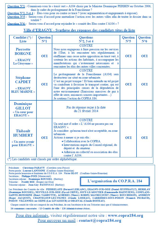 Le Comité de Ville CO.P.R.A. 184 d'Éragny vous présente la synthèse des réponses obtenues des candidats têtes de listes aux Élections Municipales des 23 et 30 mars 2014.