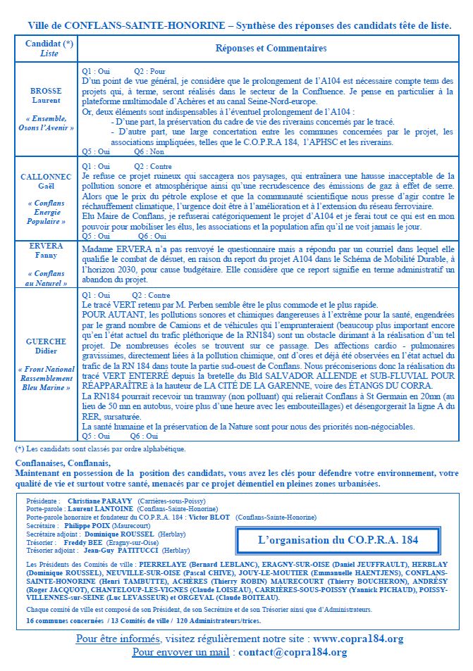 Le Comité de Ville CO.P.R.A. 184 de Conflans-Sainte-Honorine vous présente la synthèse des réponses obtenues des candidats têtes de listes aux Élections Municipales des 23 et 30 mars 2014.