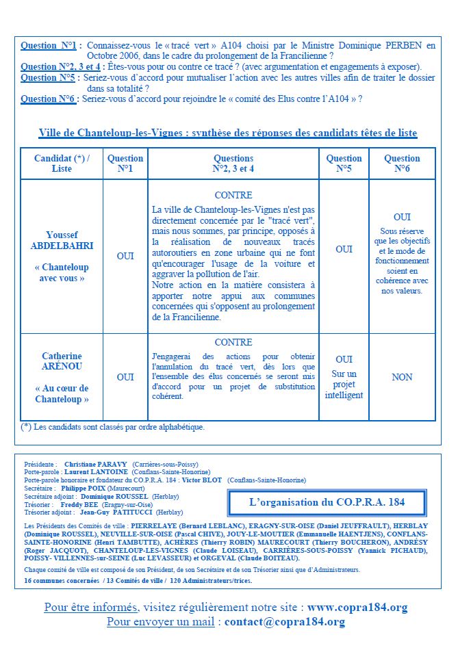Le Comité de Ville CO.P.R.A. 184 de Chanteloup-les-Vignes vous présente la synthèse des réponses obtenues des candidats têtes de listes aux Élections Municipales des 23 et 30 mars 2014.