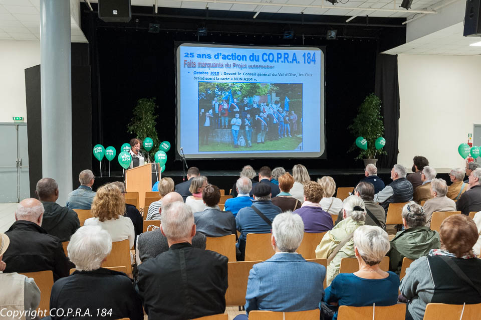 Le CO.P.R.A. 184 est un collectif : ♦ Exemplaire par son organisation décentralisée, dans chaque ville, ♦ Très participatif et démocratique, ♦ Animé par des personnes responsables, convaincues et déterminées, ♦ Soutenu par une population sensibilisée aux nuisances et aux pollutions. Cette population qui subit déjà les nuisances aériennes, surtout à Conflans, (nuisances combattues par le collectif CIRENA) comprend, mieux que tout, la légitimité de notre combat. Aujourd’hui, 25 ans après le lancement du projet A104, cet autoroute n’a toujours pas d’existence juridique car seul un débat public a eu lieu, en 2006, il y a donc bien longtemps et l’enquête publique n’a toujours pas eu lieu.