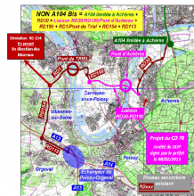 A104 Bis = cheminement à 2 fois 2 voies empruntant la RD 30 (à Achères), le futur Pont d’Achères, entre Achères et Carrières-sous-Poissy, la traversée de la plaine de Chanteloup-les-Vignes, la RD 190, et l’actuel Pont de Triel construit en 2004. Puis ce cheminement irait, soit vers le sud, en direction d’Orgeval par la RD154, soit vers le nord-ouest, en direction des Mureaux, par le projet de « Déviation de la RD154 ».
