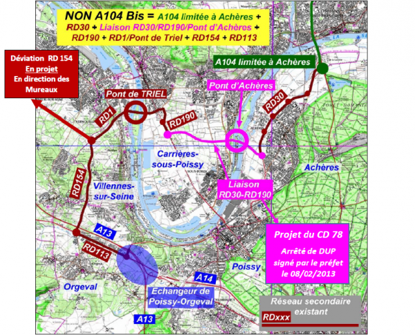 Le « Projet A104 de PROLONGEMENT de la FRANCILIENNE entre Méry-sur-Oise et Orgeval », en pleine zone urbanisée, touchant plus de 300 000 habitants, à travers les Yvelines et le Val d’Oise, est reporté à 2038, avec réexamen à partir de 2030 (Cf. le « Rapport DURON » de fév. 2018 et la « Loi sur les Mobilités » de nov. 2018), mais un autre cheminement routier à 2 fois 2 voies, initié par le Conseil départemental des Yvelines, avance, masqué, depuis quelques années … Il s’agit de la « LIAISON RD 30 / RD 190 – PONT d’ACHÈRES » qui relierait Achères à Triel-sur-Seine à travers la commune de Carrières-sous-Poissy (carte ci-dessous) et qui deviendrait très vite une nouvelle voie à très grande circulation : « autoroute A104 bis ».
