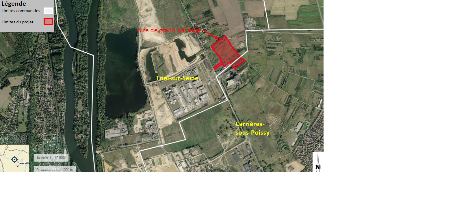 Vous trouverez le détail de ce projet sur le site de la préfecture des Yvelines : https://www.yvelines.gouv.fr/Publications/Enquetes-publiques/Urbanisme-Amenagement/Creation-d-une-aire-de-grand-passage-a-Carrieres-sous-Poissy-et-Triel-sur-Seine