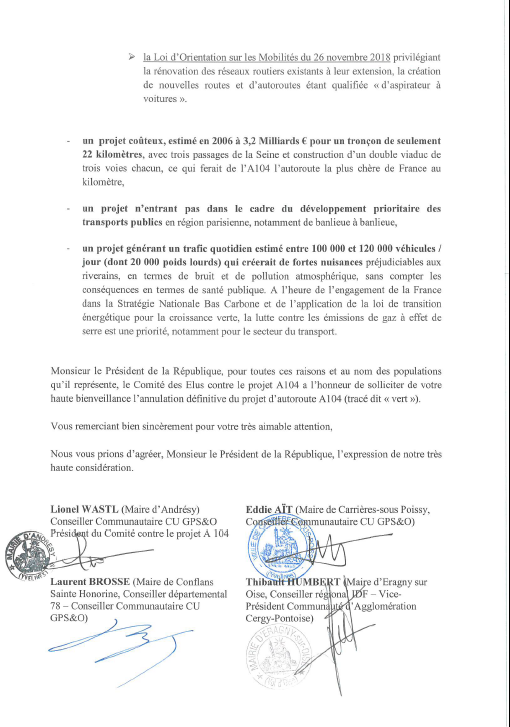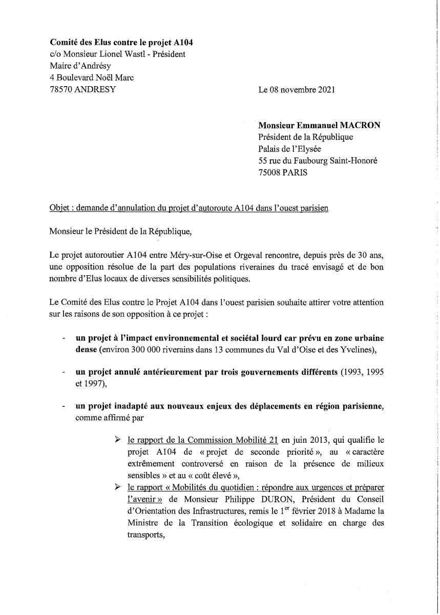 Le comité des élus contre le projet A104 a écrit au Président de la République pour demander l'annulation du projet.