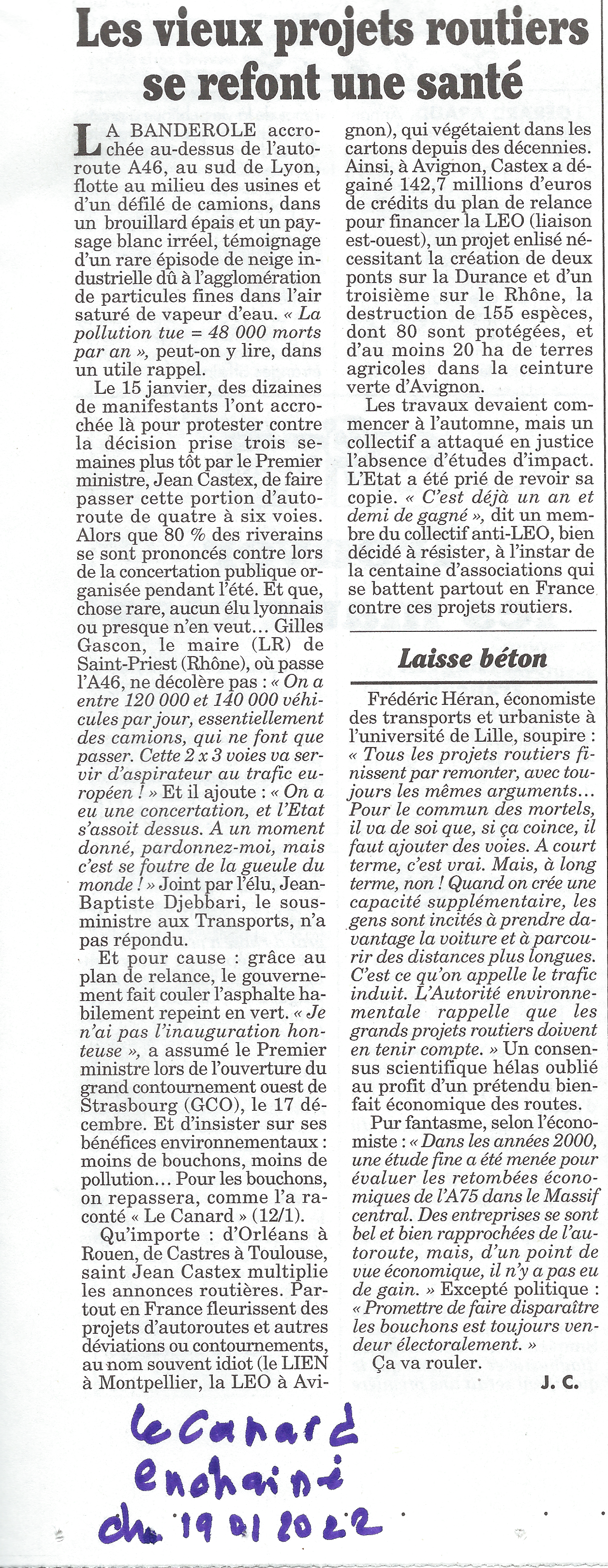 Un article du Canard Enchaîné du 19/01/2022 (en pièce jointe) liste les nombreux projets autoroutiers débloqués récemment par le gouvernement. Nous détaillons ci-après ces différents projets.