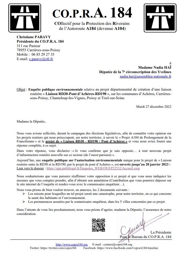 Vous trouverez ci-joint le courrier adressé à la députée de la 7e circonscription des Yvelines, Madame Nadia Hai. Nous vous tiendrons au courant de sa réponse.