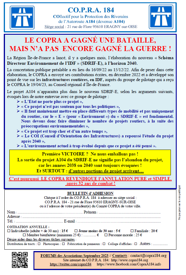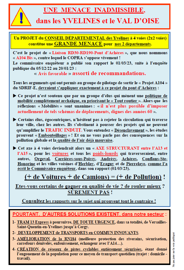 Cela a été l'occasion de distribuer le tract de rentrée du Copra ainsi que, dans certains forums, le tract de l'association "Non au Pont d'Achères" contre le projet de liaison à 2x2 voies "RD30/RD190/Pont d'Achères" (documents joints).