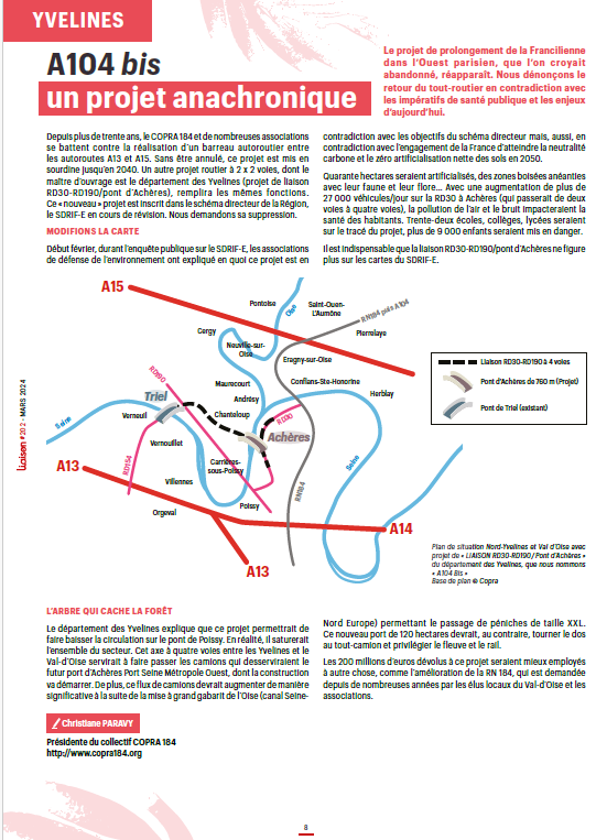 France Nature Environnement parle de la laison 2x2 voies RD30/RD190 Pont d'Achères (l'A104 bis) dans son bulletin Liaisons N° 202 de mars 2024. voir lien
