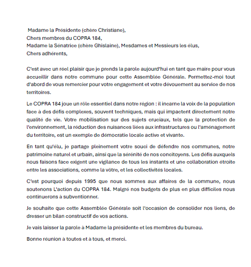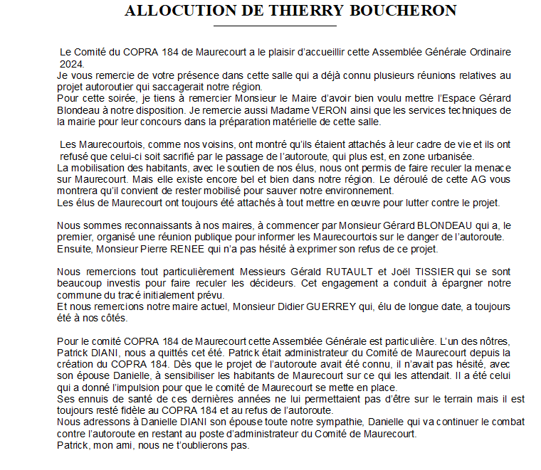En tant que présidente du collectif CO.P.R.A. 184, Christiane Paravy a l’honneur et le très grand plaisir de souhaiter à tous, la bienvenue, à l'Assemblée Générale Ordinaire, qu'elle déclare ouverte et qui se tient à Maurecourt, pour la 2e fois..