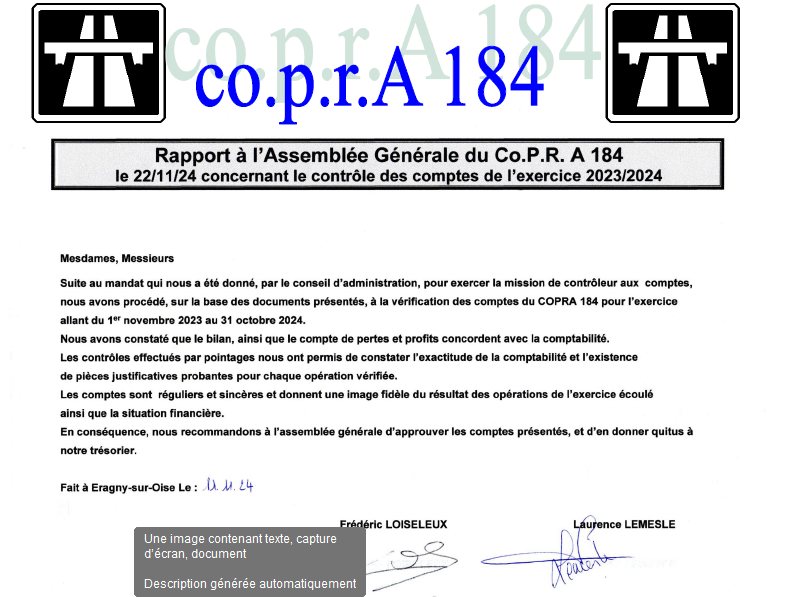 La Présidente du CO.P.R.A.184 annonce qu’elle convoque les administrateurs nouvellement élus, conformément à l’article 12 des statuts, pour le :Mercredi 11 décembre 2024 à 20h00 au Chalet Denouval à Andrésy.