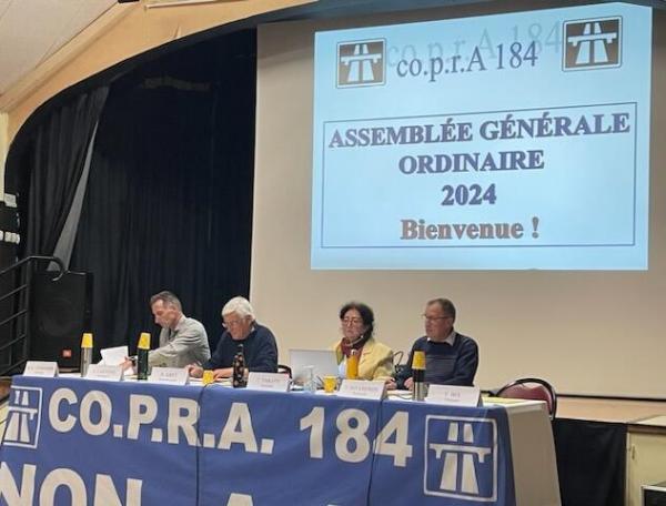"L'Assemblée Générale Ordinaire du CO.P.R.A 184 confirme, comme le prévoient les statuts du CO.P.R.A.184, la possibilité d'engager, à partir de la date de la présente Assemblée, toutes actions juridiques ou contentieuses devant toutes juridictions compétentes - notamment juridictions administratives - et dans ce cas sous forme de recours de tout acte ou décision, concernant le « PROLONGEMENT DE LA FRANCILIENNE ou toute autre infrastructure, en liaison avec ce Prolongement (Pont d’Achères, entre Achères et Carrières-sous-Poissy / Port Seine-Métropole-Ouest PSMO / Requalification de la RD190, entre Poissy et Triel-sur-Seine) dans les Yvelines et le Val d’Oise.