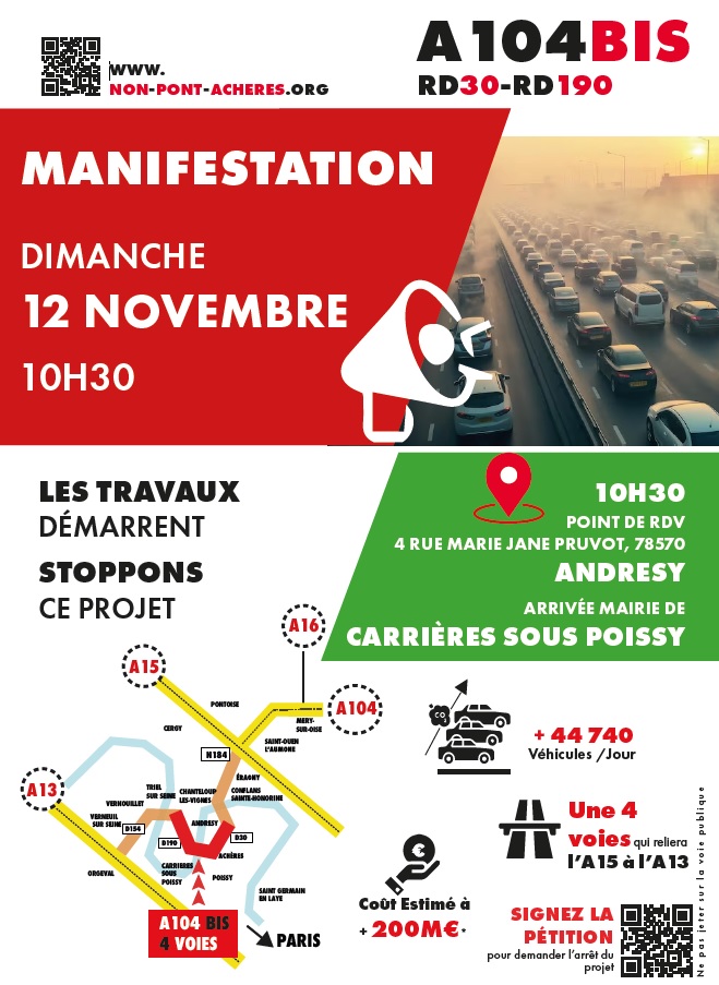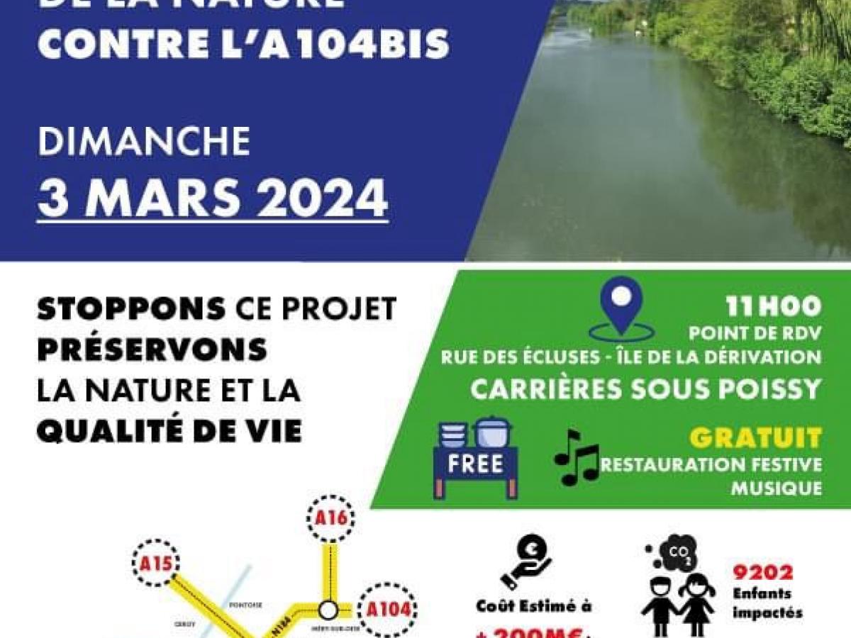 Nous vous attendons nombreux le 12/11/2023 à la manifestation contre l'A104 bis, avec famille, amis, enfants, parents, grands-parents... Nous sommes tous concernés par ce projet très destructeur pour la SANTE des habitants des Yvelines et du Val d'Oise (Augmentation importante du NIVEAU SONORE et des POLLUTIONS Atmosphériques, à cause du TRAFIC INDUIT par ce projet) et également pour nos "POUMONS VERTS" (Lieux de promenade et de loisirs où nous nous ressourçons et qui sont indispensables, dans notre ENVIRONNEMENT).