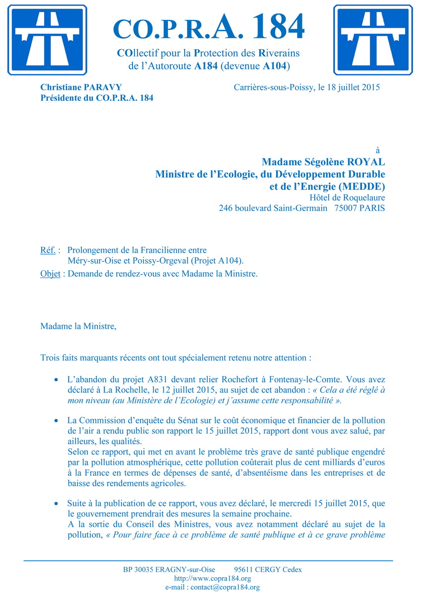 Nous sommes persuadés que vous aurez à cœur de sauvegarder la santé des populations concernées par le projet A104 et la qualité de leur environnement, comme vous l’avez déjà fait pour d’autres projets.