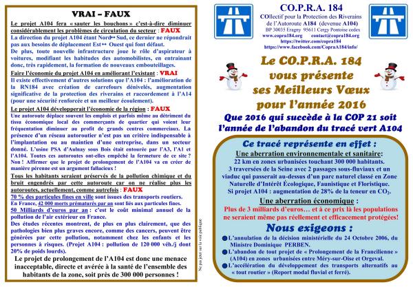 Pour cette raison, nous avons fait le choix d'adresser la carte de vœux 2016 du CO.P.R.A. 184 aux Élus, aux Autorités, à la Presse. Nous distribuerons la carte de vœux dans les boites à lettres des habitants des villes concernées directement ou indirectement par le tracé vert A104.