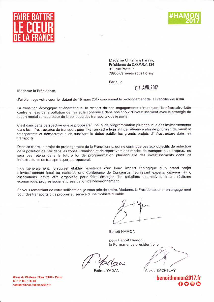 Commentaire : la réponse de Benoît HAMON est sans ambiguïté quand il écrit : "Dans ce cadre, le projet de prolongement de la Francilienne, qui ne contribue pas aux objectifs de réduction de la pollution de l'air dans les zones urbanisées et de report vers des modes de transports plus propres, ne sera pas retenu dans la future loi de programmation pluriannuelle des investissements dans les infrastructures de transport que je proposerai." Dont acte.