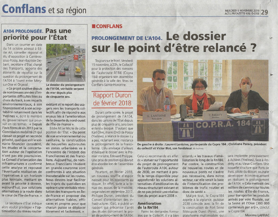 Article de la gazette du val d'Oise du 6 novembre 2019 : le prolongement de l'A104 à la relance ? (voir dossir attaché)