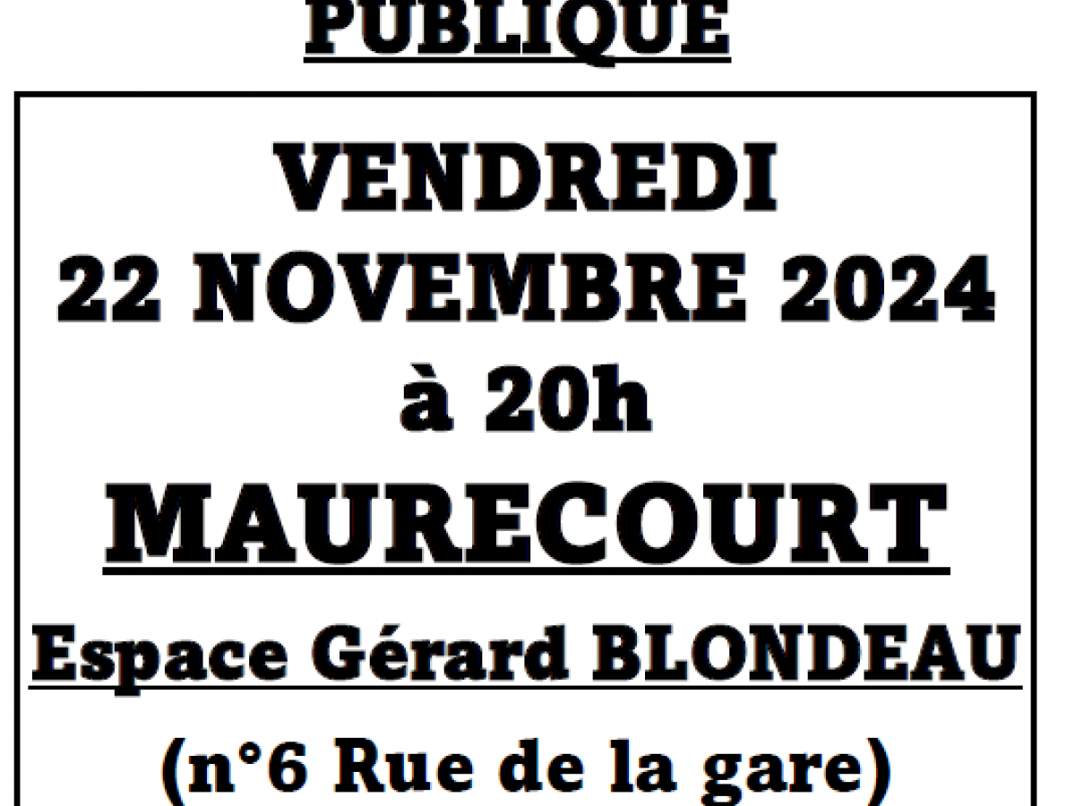 Nous vous attendons nombreux à notre assemblée générale ordinaire du 22/11/2024 à l'Espace Blondeau de Maurecourt à partir de 20h (n°6 Rue de la gare).