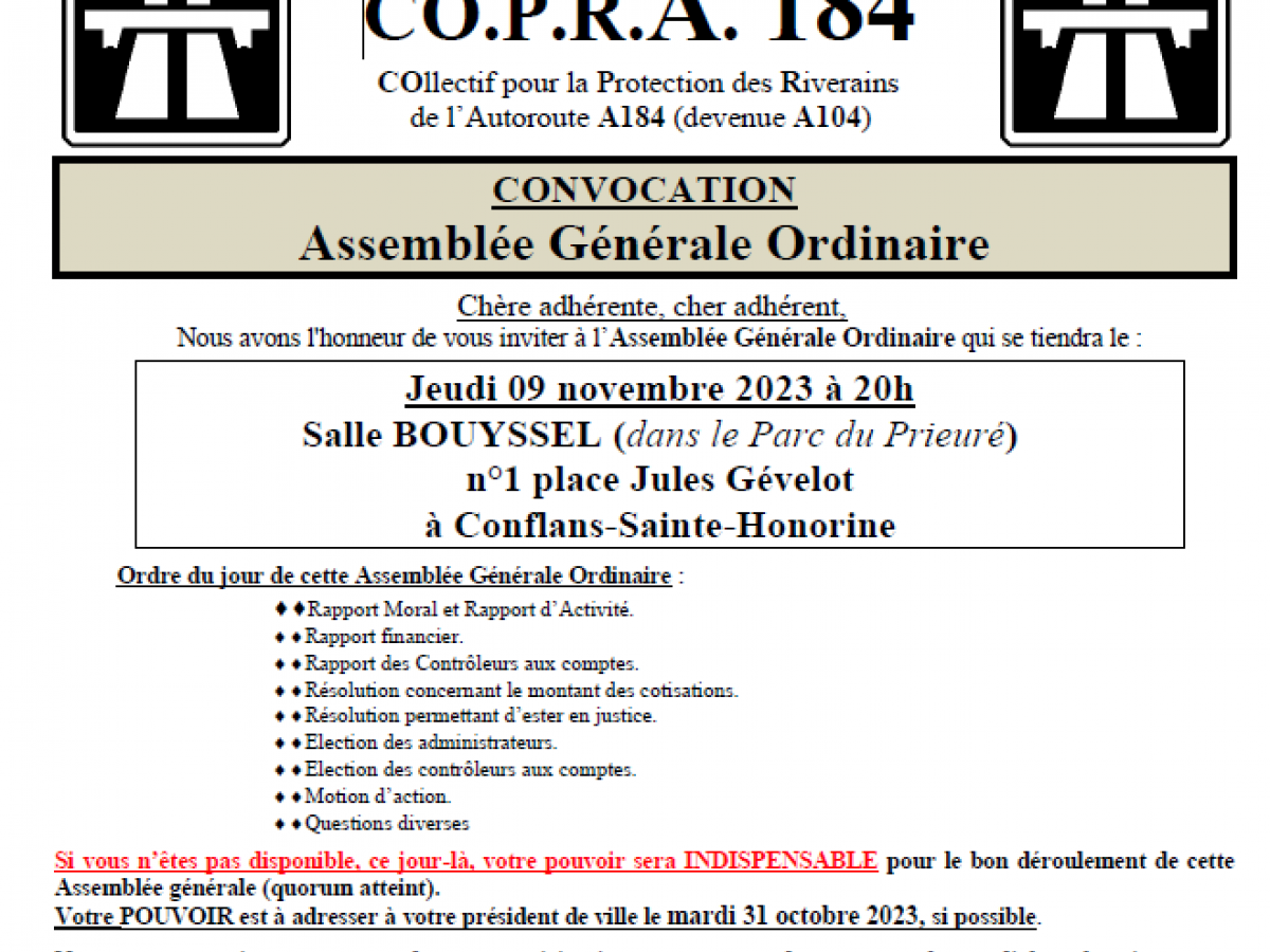 L'Assemblée Générale Ordinaire du COPRA, pour l'exercice 2022-2023, s'est tenue le Jeudi 09 novembre 2023, à la salle Bouyssel de Conflans-Sainte-Honorine